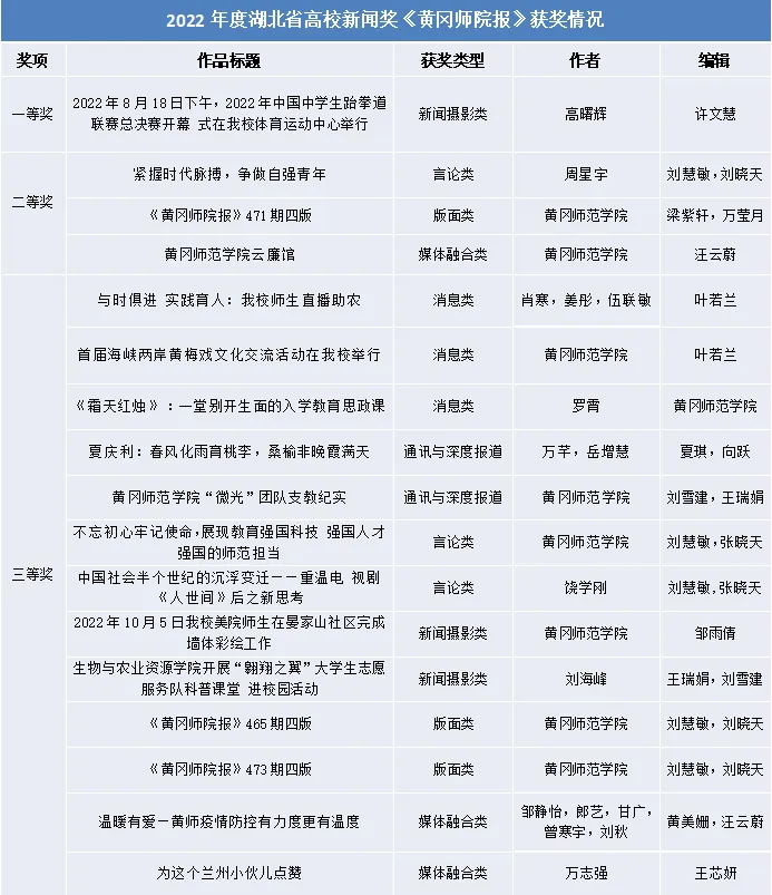 其中,《2022年8月18日下午,2022年中国中学生跆拳道联赛总决赛开幕式在我校体育运动中心举行》获新闻摄影类一等奖;《黄冈师院报》471期四版获版面类二等奖,《紧握时代脉搏,争做自强青年》获得言论类二等奖,《国产精品永久久久久久久久久|91精品无码国产在线观看一区|久久人爽爽人爽爽ąV无码自慰|最新无码国模国产在线|2020最新无码国产在线观看云廉馆》获媒体融合类二等奖;《2022年10月5日我校美院师生在晏家山社区完成墙体彩绘工作》、《生物与农业资源学院开展“翱翔之翼”大学生志愿服务队科普课堂进校园活动》获新闻摄影类三等奖,《黄冈师院报》465期四版、473期四版获版面类三等奖、《与时俱进 实践育人:我校师生直播助农》、《首届海峡两岸黄梅戏文化交流活动在我校举行》、《<霜天红烛>:一堂别开生面的入学教育思政课》获消息类三等奖;《夏庆利:春风化雨育桃李,桑榆非晚霞满天》、《国产精品永久久久久久久久久|91精品无码国产在线观看一区|久久人爽爽人爽爽ąV无码自慰|最新无码国模国产在线|2020最新无码国产在线观看“微光”团队支教纪实》获通讯与深度报道类三等奖;《不忘初心牢记使命,展现教育强国科技强国人才强国的师范担当》、《中国社会半个世纪的沉浮变迁——重温电视剧<人世间>后之新思考》获言论类三等奖;《温暖有爱—黄师疫情防控有力度更有温度》、《为这个兰州小伙儿点赞》获媒体融合类三等奖。