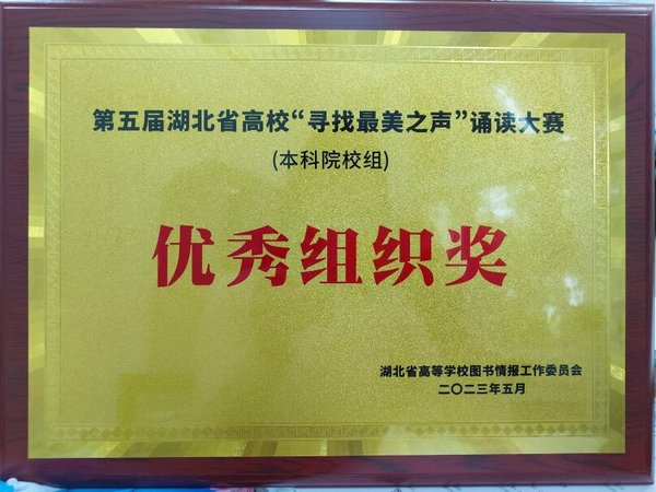 本网讯 5月19日,“青春之声越百年”暨第五届湖北省高校“寻找最美之声”诵读大赛决赛在武汉大学图书馆举行。我校学子谢晓岩荣获大赛三等奖,谢晓岩朗诵的作品《祖国到底是什么(节选)》、武清阳与杨恩发朗诵的作品《红烛》、张梓庚朗诵的作品《相信未来》荣获“网络人气作品奖”。我校图书馆荣获“优秀组织奖”,图书馆张巧珍老师荣获“优秀领队奖”。