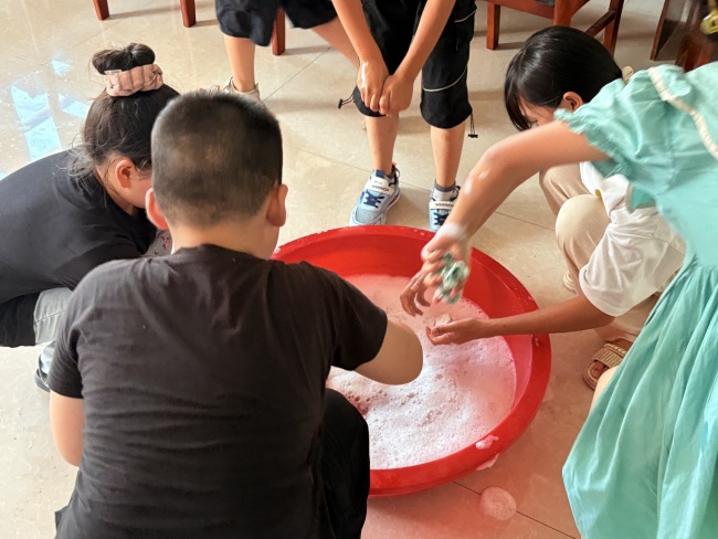 白果镇渡桥村的劳育课程,是一场热闹的“卫生大扫除”。志愿者们带领孩子们分工合作:有的负责清扫走廊的垃圾,有的擦拭宣传栏的灰尘,有的负责扫地拖地。“老师,您看我扫得多干净!”一个小男孩举着扫帚自豪地说。经过一上午的忙碌,教室变得整洁有序。看着焕然一新的环境,孩子们脸上露出了满足的笑容。劳动让他们懂得,付出汗水才能收获美好,也让“劳动最光荣”的信念扎根心底。