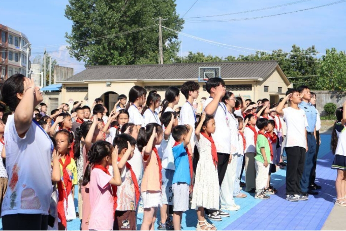 庄严的周一清晨,周家乐肩扛五星红旗,担任主旗手。正步铿锵有力,鞋跟砸地的回响叩击校园寂静;展臂绷直如弦,透射出千锤百炼的力量。“1、2、3……”有孩子小声跟着步点数着。国歌奏响,展旗、抛旗、升旗动作行云流水。五星红旗在朝阳的金辉中冉冉升起,照亮了台下孩子们清澈而专注仰望的眼眸。国旗下,周家乐深情讲述军营里“国旗重于生命”的铁律。“叔叔,国旗真的比命还重要吗?”一个女孩小声问。“是的,”周家乐眼中光芒如炬,斩钉截铁地回答,“因为国旗代表的就是我们脚下的土地,我们的家,我们的国!保护她,是我们最神圣的使命!”随即,他带领全体小学生高声朗诵:“少年智则国智,少年强则国强!”稚嫩却无比坚定的童声汇成洪流,在山野间激荡回响。孩子们不自觉地攥紧拳头,挺直了小小的脊背,字字句句饱含着对家国那份懵懂却无比炽热的爱。这一刻,一颗颗幼小而滚烫的心,正经历着一场庄重的精神洗礼与启蒙。